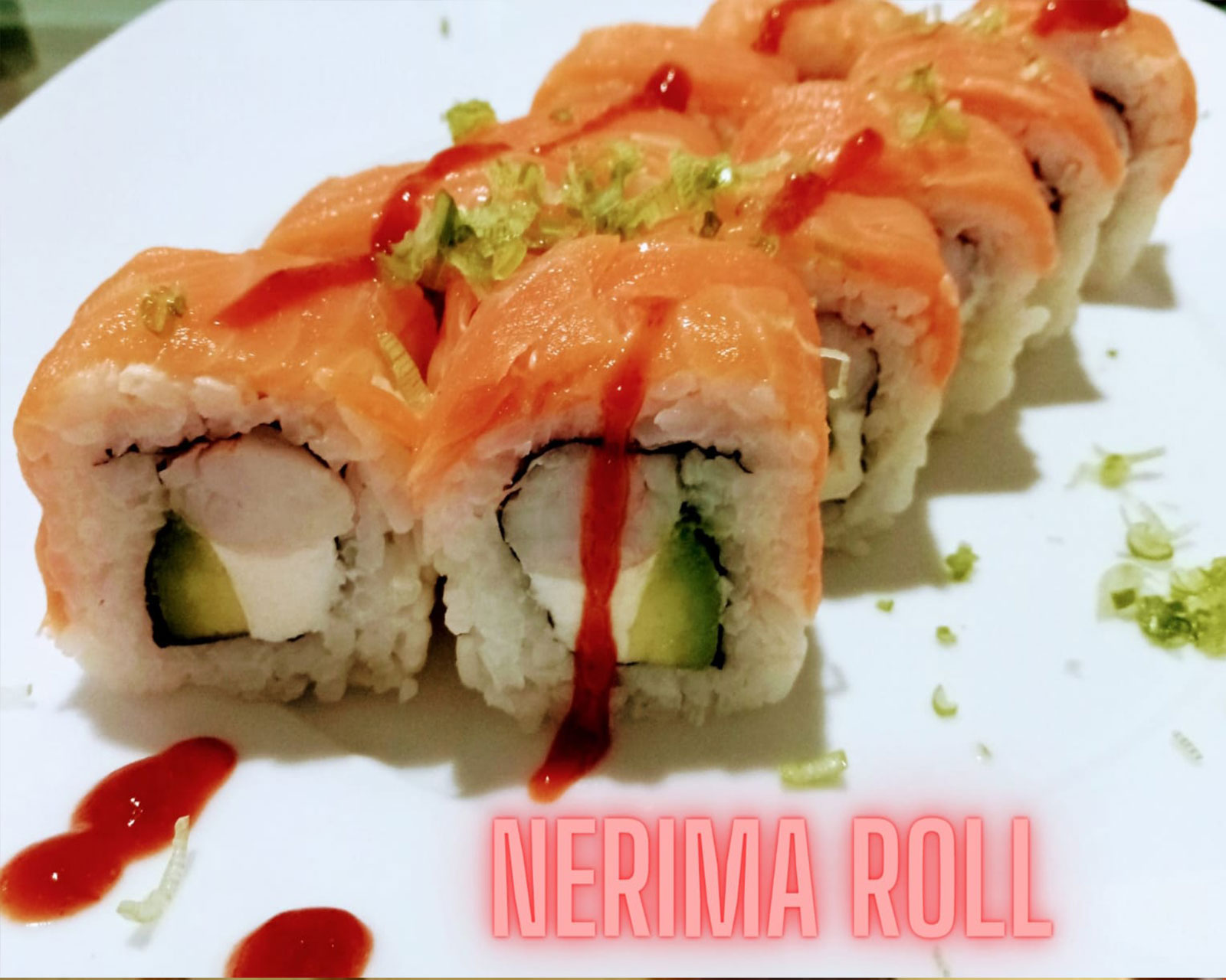 Camarón, aguacate, y filadelfia por dentro, aguacate por fuera, suave spicy encima.